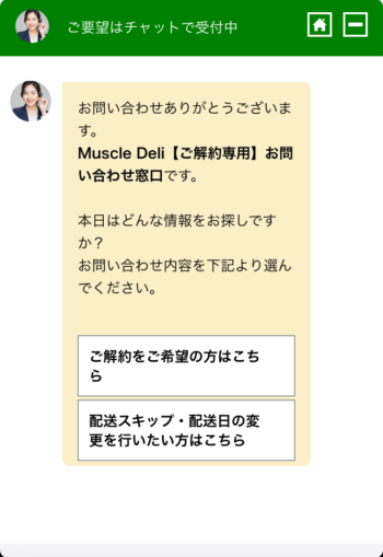 | ①解約 | ・アカウントは残った状態 ・マッスルデリの定期便をやめたい ・今後マッスルデリを再開する予定が少しでもある |
