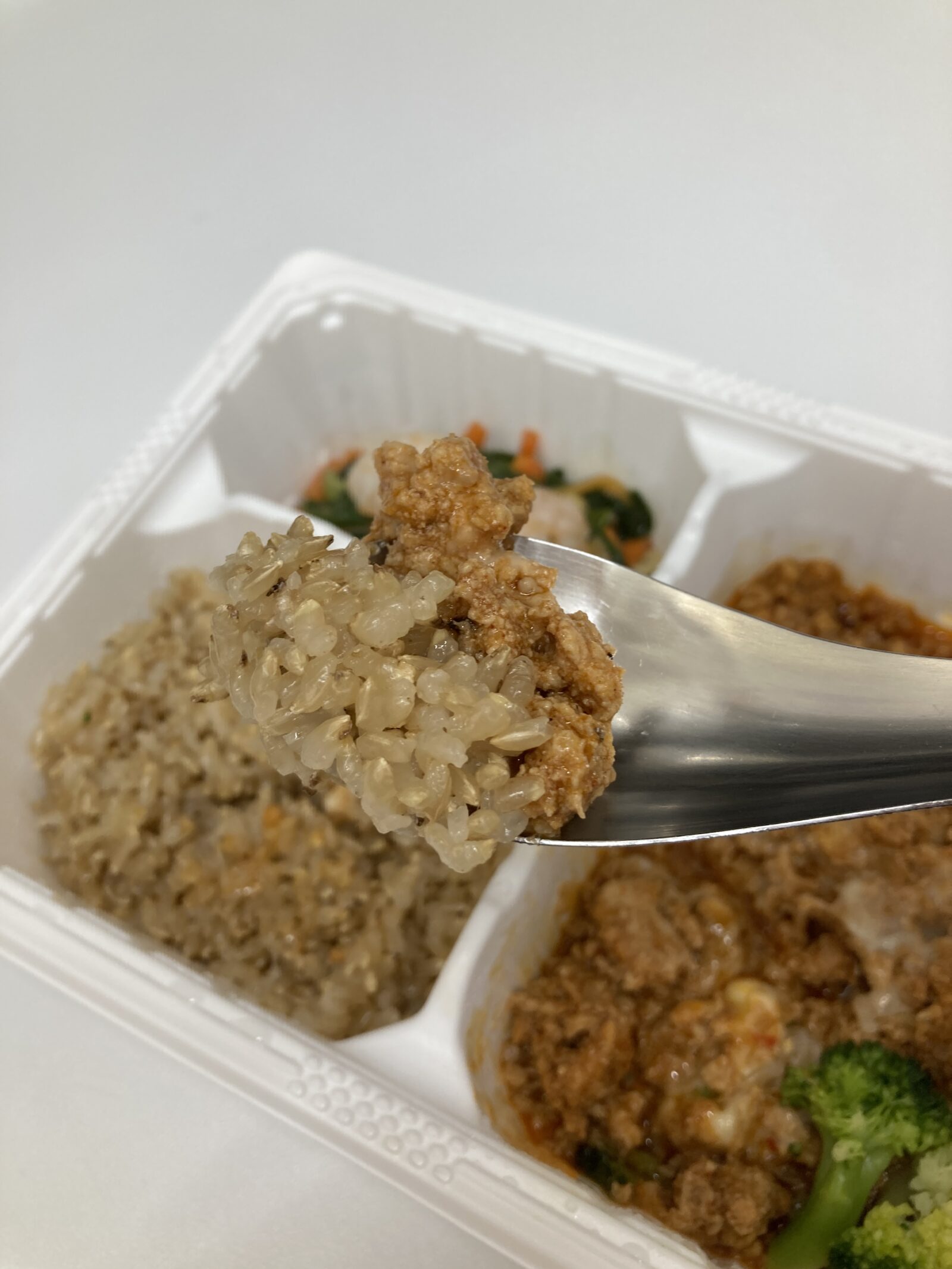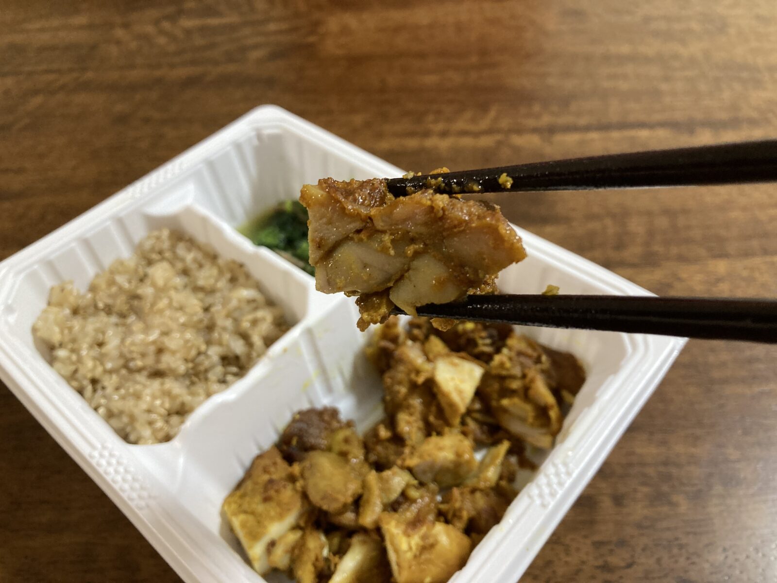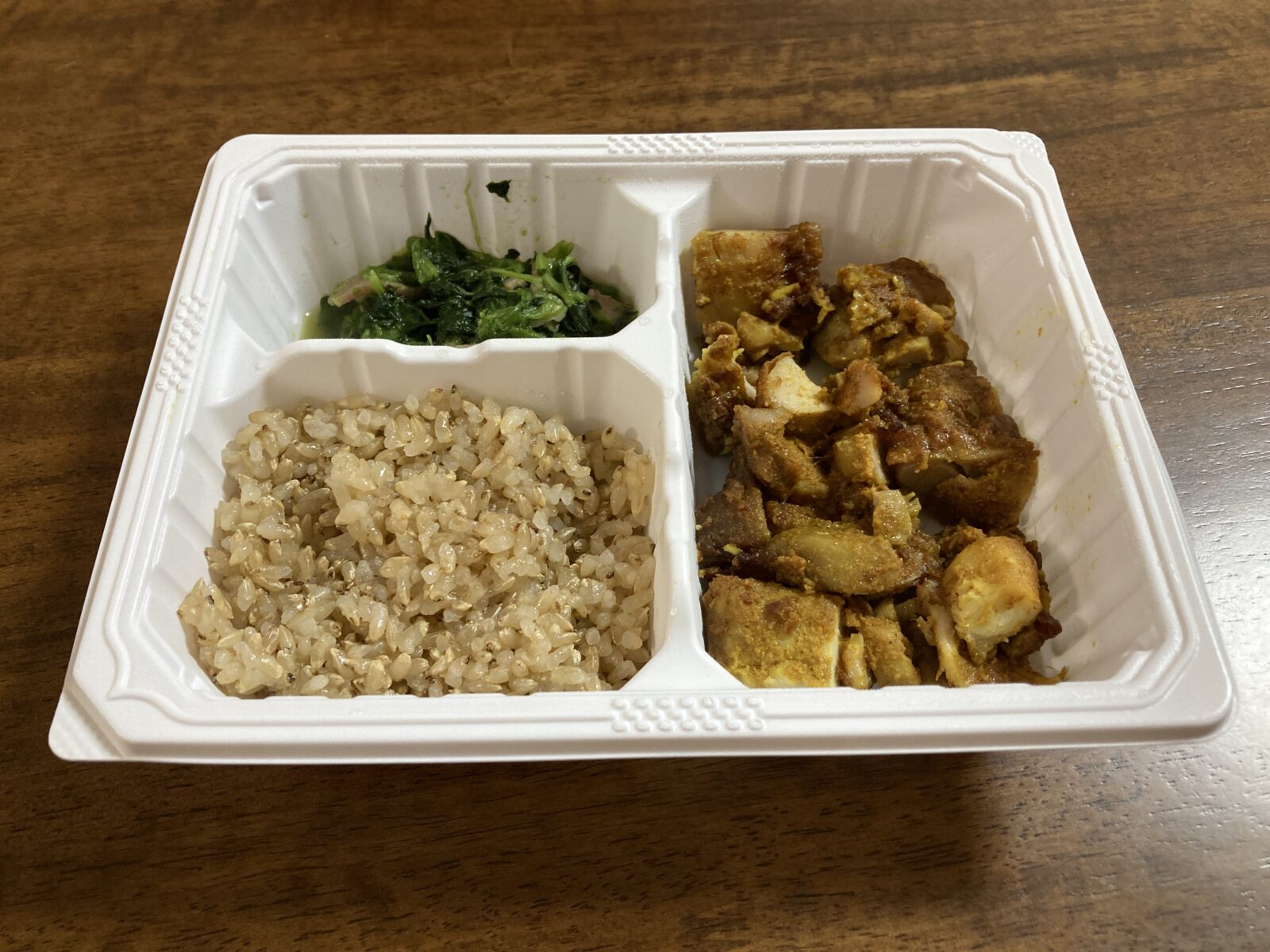 まず最初に、このスパイシータンドリーチキンは一口食べるとスパイシーな香りが広がり、しっかりとした味付けがクセになります!ほうれん草のベーコン炒めも旨味が引き立っていて、玄米ご飯との相性も抜群です。全体的にバランスの良い食事で、満足感が高いですね。
