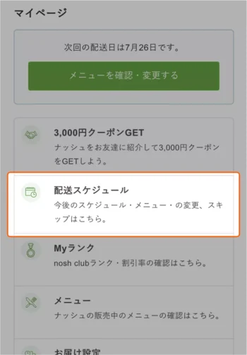 「スキップ」の手続きを行うと、指定日のみnosh(ナッシュ)の定期配送を停止できます。