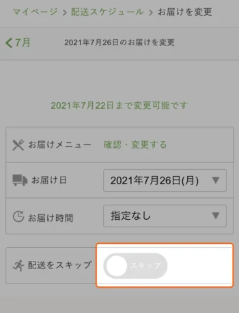 - 「配送をスキップ」の右横のバーを選択し、表示がグレーから赤になったら完了