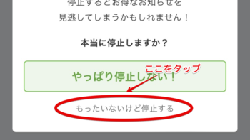 ⚠️CAUTION画面で「もったいないけど停止する」をタップ - アンケートに回答し「停止する」をタップ