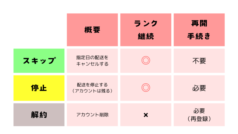 次では、解約(退会)・停止・スキップの違いについて説明します。