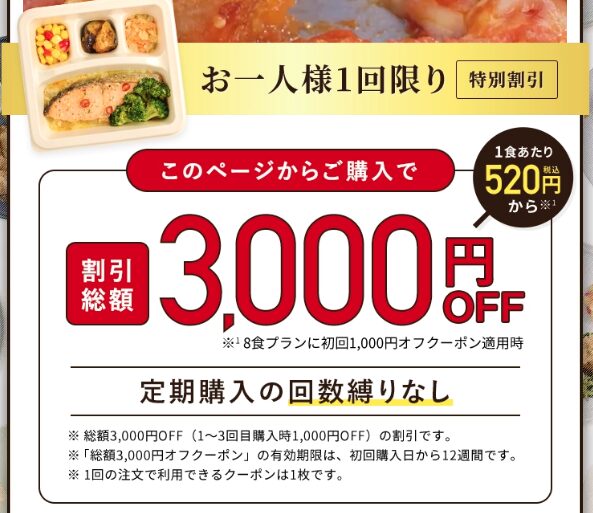 どうせ始めるならお得に始めたいというのが本音かも。それならこちらのリンクタップで3,000円OFFクーポン(1,000円OFF✕3枚)をGETしてください。ナッシュを3,000円OFFで始める>>>