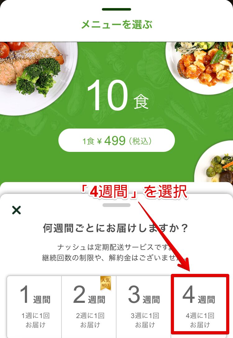 ナッシュの注文で悩むとすれば食数を選ぶ、配送間隔を選ぶ、メニュー選びです。