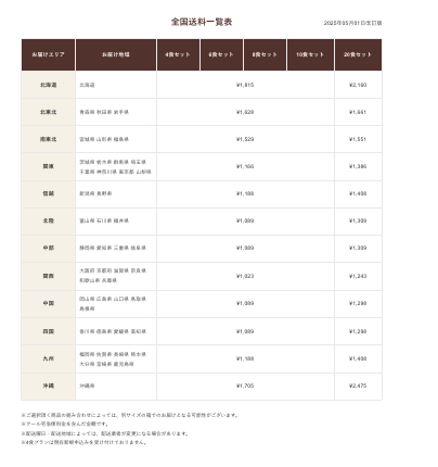自社配送地域では、外注コストを削減できるため送料が安くなっています。全国の送料一覧表も参照できます。