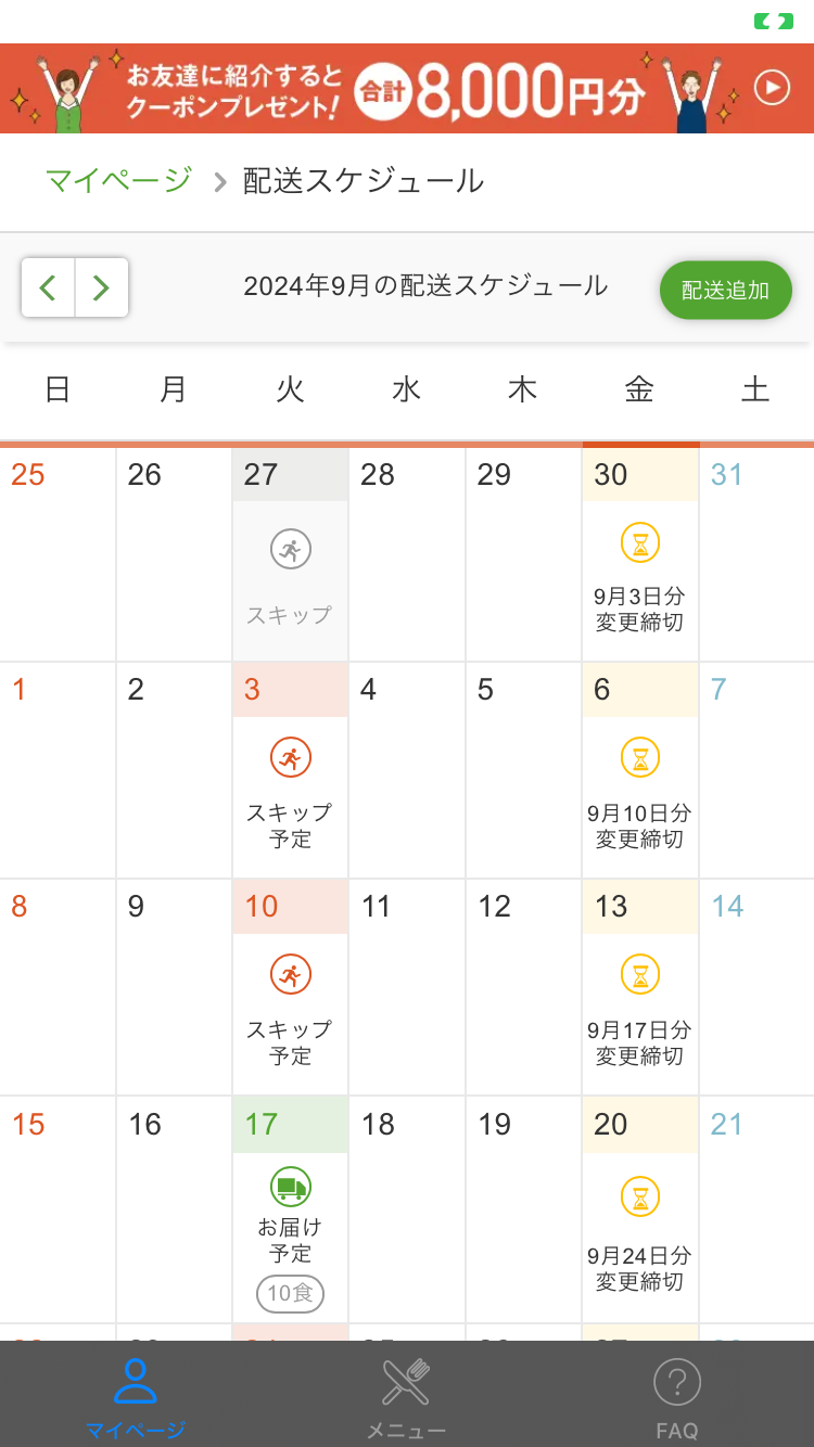 このように、マイページからは配達日時だけでなくメニューも変更が可能です。