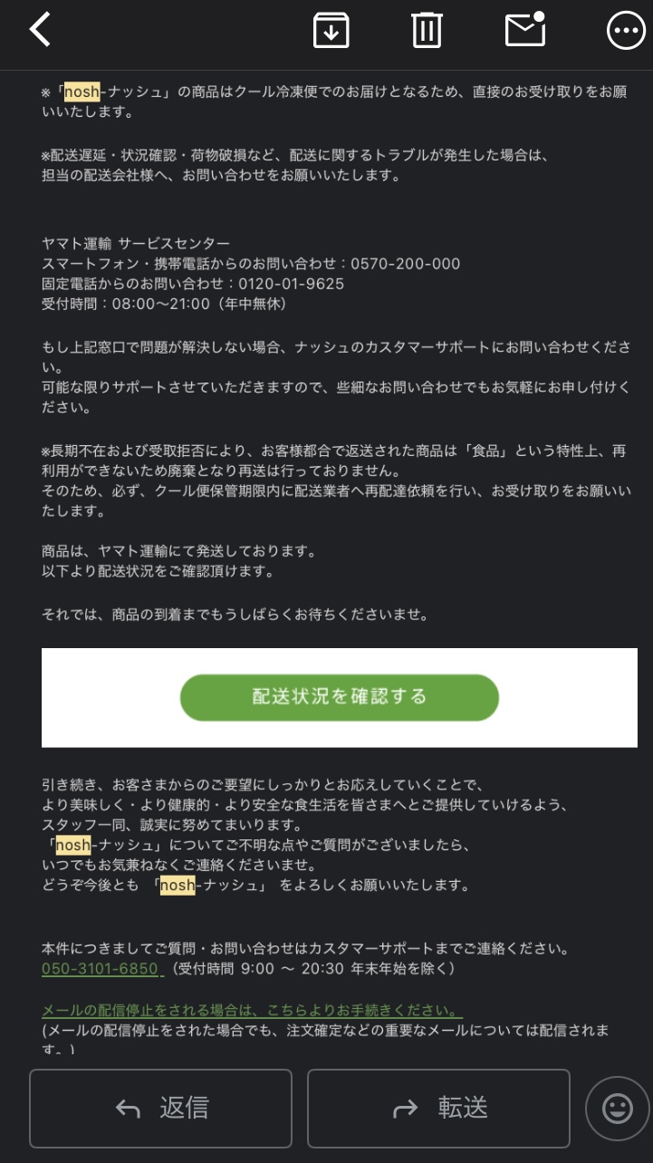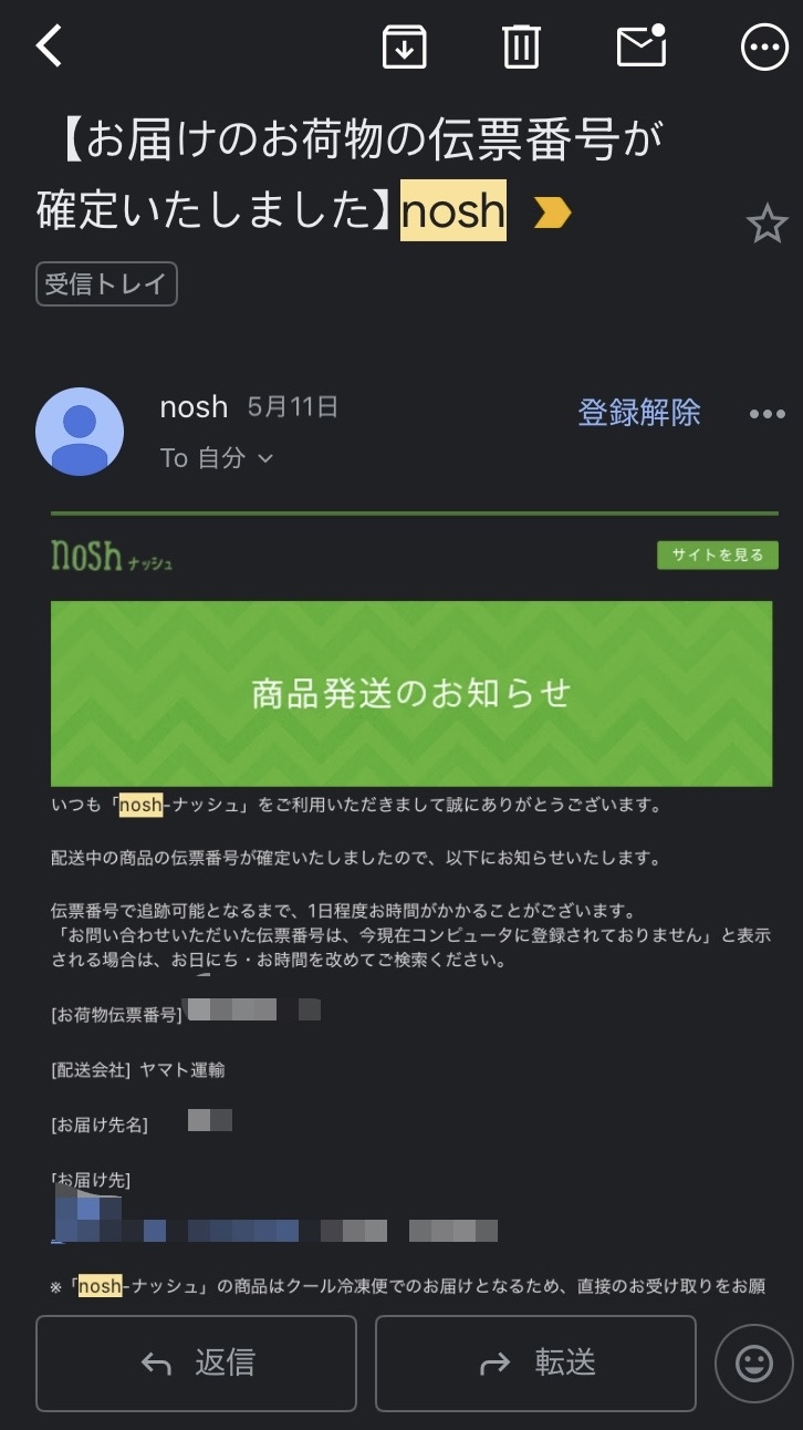 noshから【お届けのお荷物の伝票番号が確定しました】メールが届いてから、