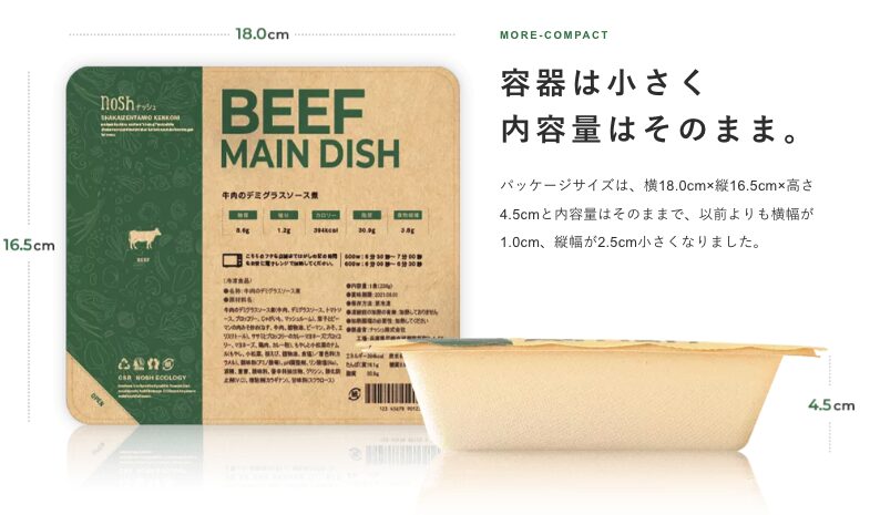 容器は紙製で、コンビニ弁当の容器よりコンパクトです。サイズは縦18cm×横16.5cm×高さ4.5cmです。