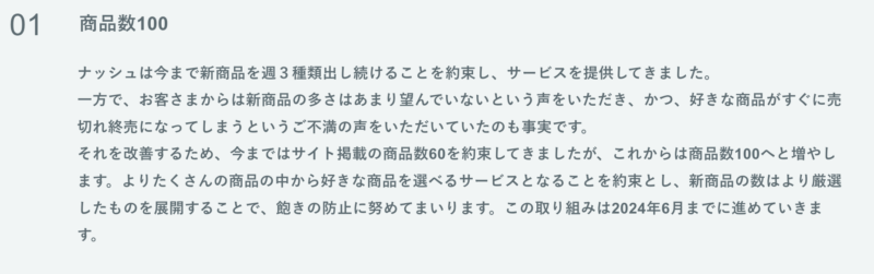 nosh(ナッシュ)の公式サイトには「取り組み」という項目があります。